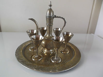 VINTAGE COLLECTABLE INDIA BRASS JUG / URN & 6 GOBLETS & TRAY