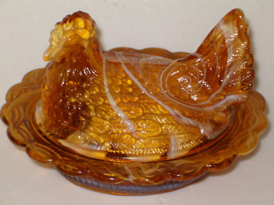 AMBER & MILK SLAG GLASS HEN CHICKEN ON NEST BASKET DISH