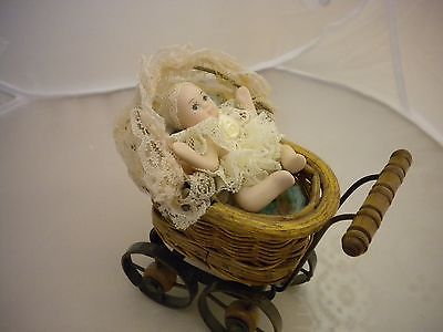 Vintage Miniature Wicker Doll Carriage/w Porcelain Doll