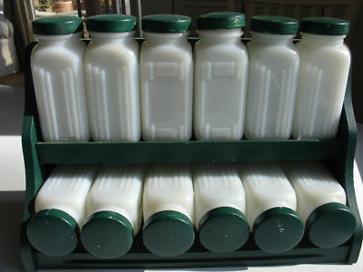 12 DECO VINTAGE Milk Glass SPICE JARS & rack w/LIDS