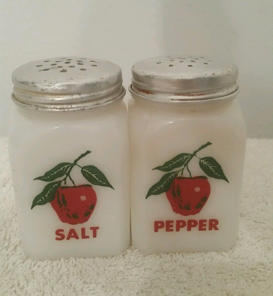 Title (ebay affiliate link): Vintage Milk Glass Salt & Pepper Shakers -with Apple Design -Made in the USA
