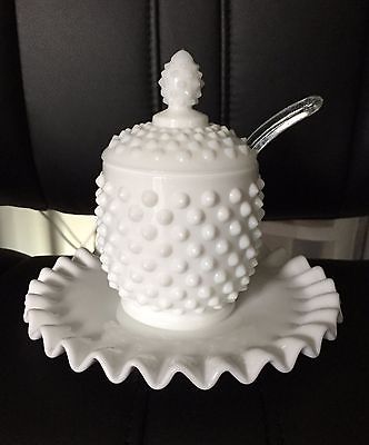 Vintage Fenton Milk Glass Hobnail Mustard Jam 4-pcs Set: Jar w/ Lid Saucer Ladle