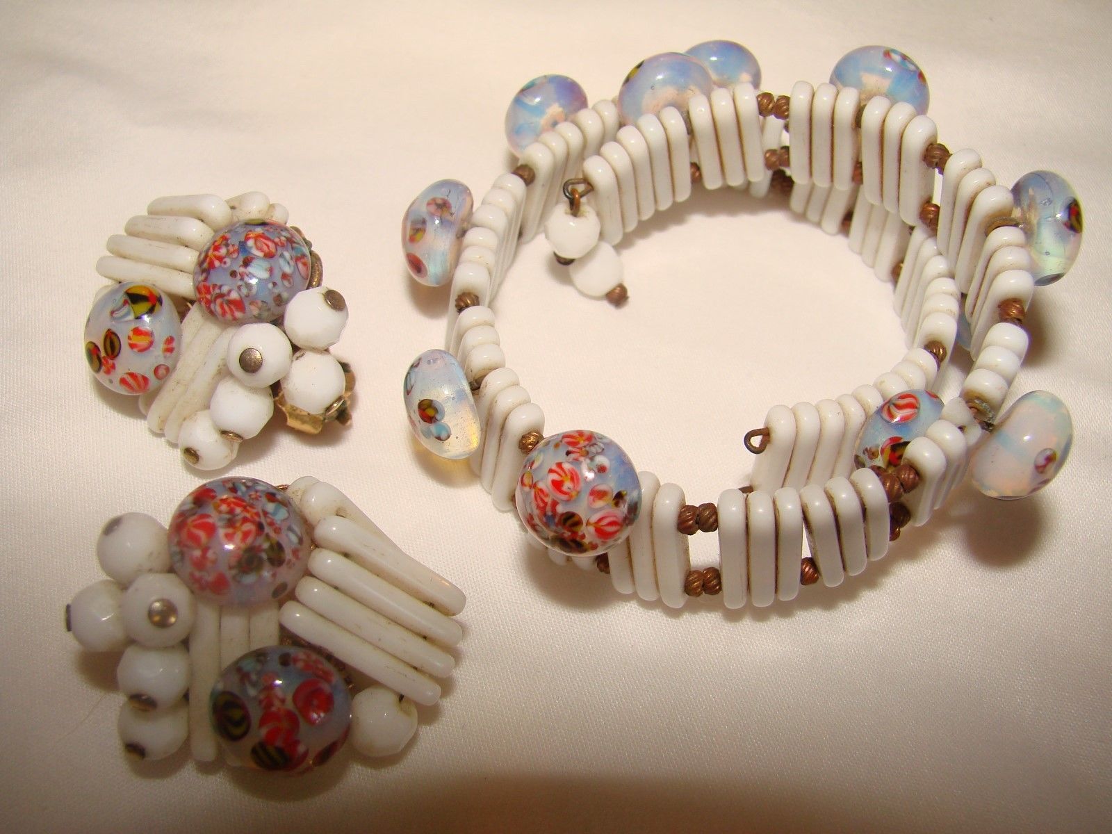 Title (ebay affiliate link): VTG UNSIGNED HIGHEND DESIGNER ART GLASS MARBLE MILKGLASS BRACELET EARRINGS SET