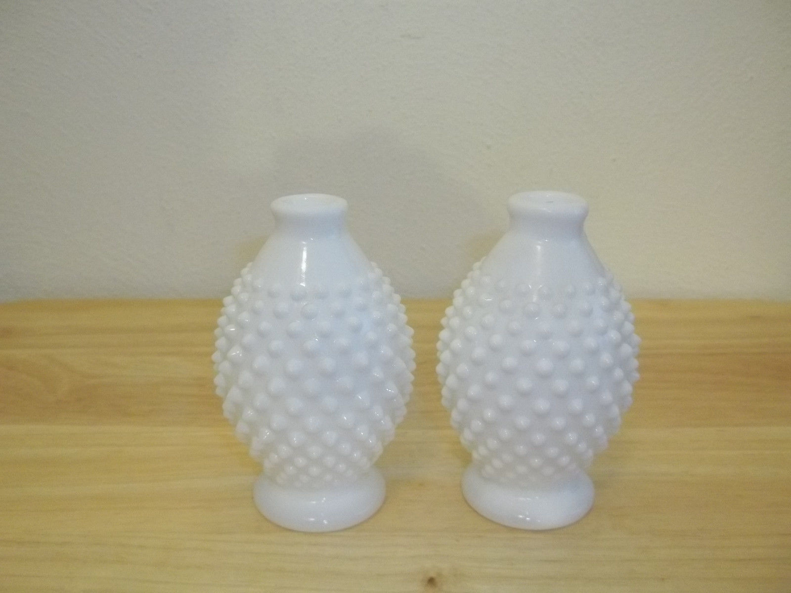 PAIR OF WHITE MILK GLASS HOBNAIL BUD VASES 4" TALL