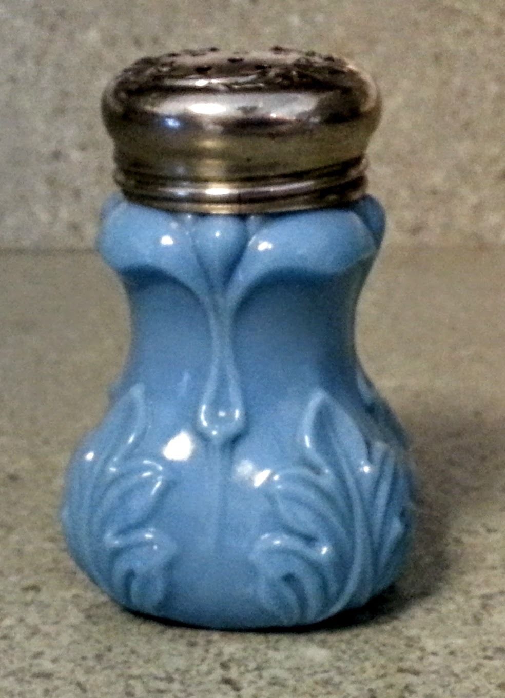 Title (ebay affiliate link): ANTIQUE~VICTORIAN~SHAKER~BLUE~MILK~GLASS~LEAVES~FLORAL~SCROLL~W/MATCHING LID~VTG