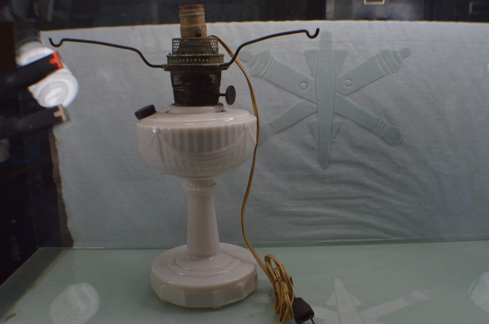 Title (ebay affiliate link): Aladdin Lincoln drape milk glass oil lamp, converted electric