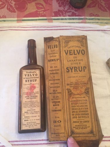Title (ebay affiliate link): Vintage Thedford's VELVO or Laxative Liver SYRUP Embossed Bottle & Paper Label