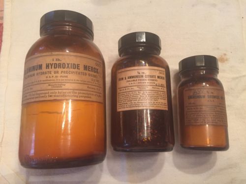 Title (ebay affiliate link): 3 Bulk Merck Bottles Paper Labels And Embossed Tops Vintage Pharmacy Apothecary
