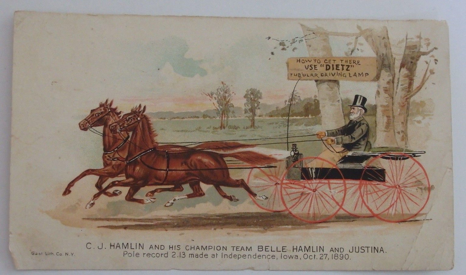1800'S VICTORIAN TRADE CARD DIETZ TUBULAR HORSE & BUGGY DRIVING LAMP