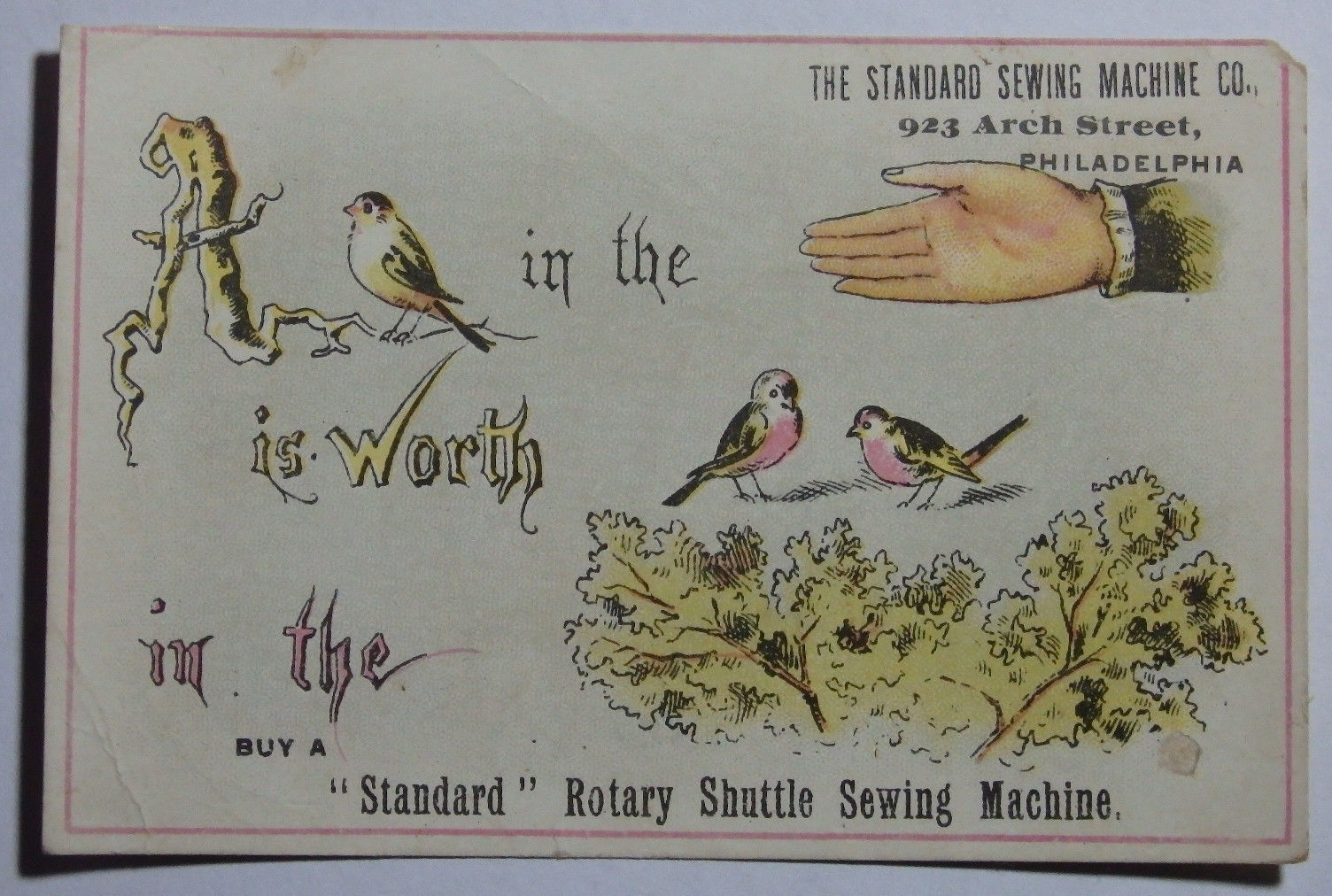 Title (ebay affiliate link): 1890 VICTORIAN TRADE CARD STANDARD SEWING MACHINE DST J E F BURGESS FREDERICK MD