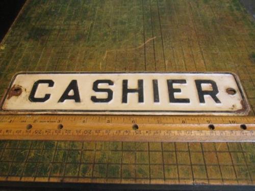Title (ebay affiliate link): Vintage Stamped Embossed Metal 'CASHIER' Sign Raised Letters 10 3/4 x 2 1/2"