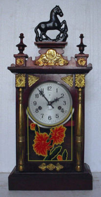 ANTIQUE HORSE FINIAL BRASS DECO COLUMN MANTLE CLOCK