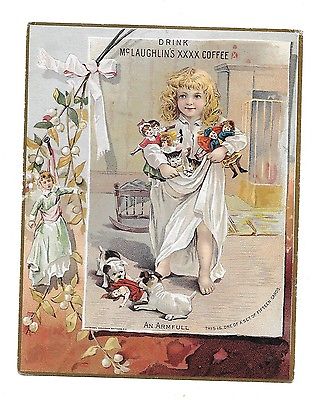 Title (ebay affiliate link): Cute Girl holding AN ARMFUL OF TOYS w/ dogs pulling on doll MCLAUGHLINS COFFEE