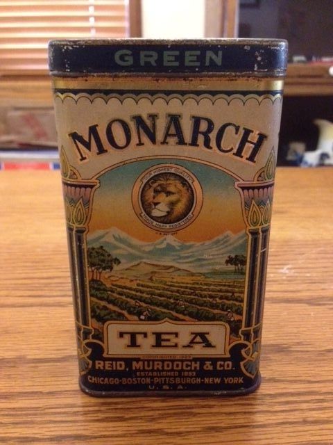Title (ebay affiliate link): Antique Circa 1920's Monarch Green Tea Tin 6 in. tall w/Hinged Tin Top 8 oz.