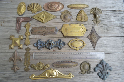Title (ebay affiliate link): Job lot of original antique furniture mounts pressed brass copper ormalu 1