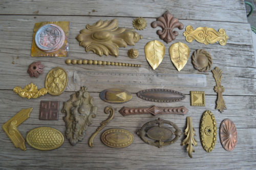 Title (ebay affiliate link): Job lot of original antique furniture mounts pressed brass copper ormalu 3