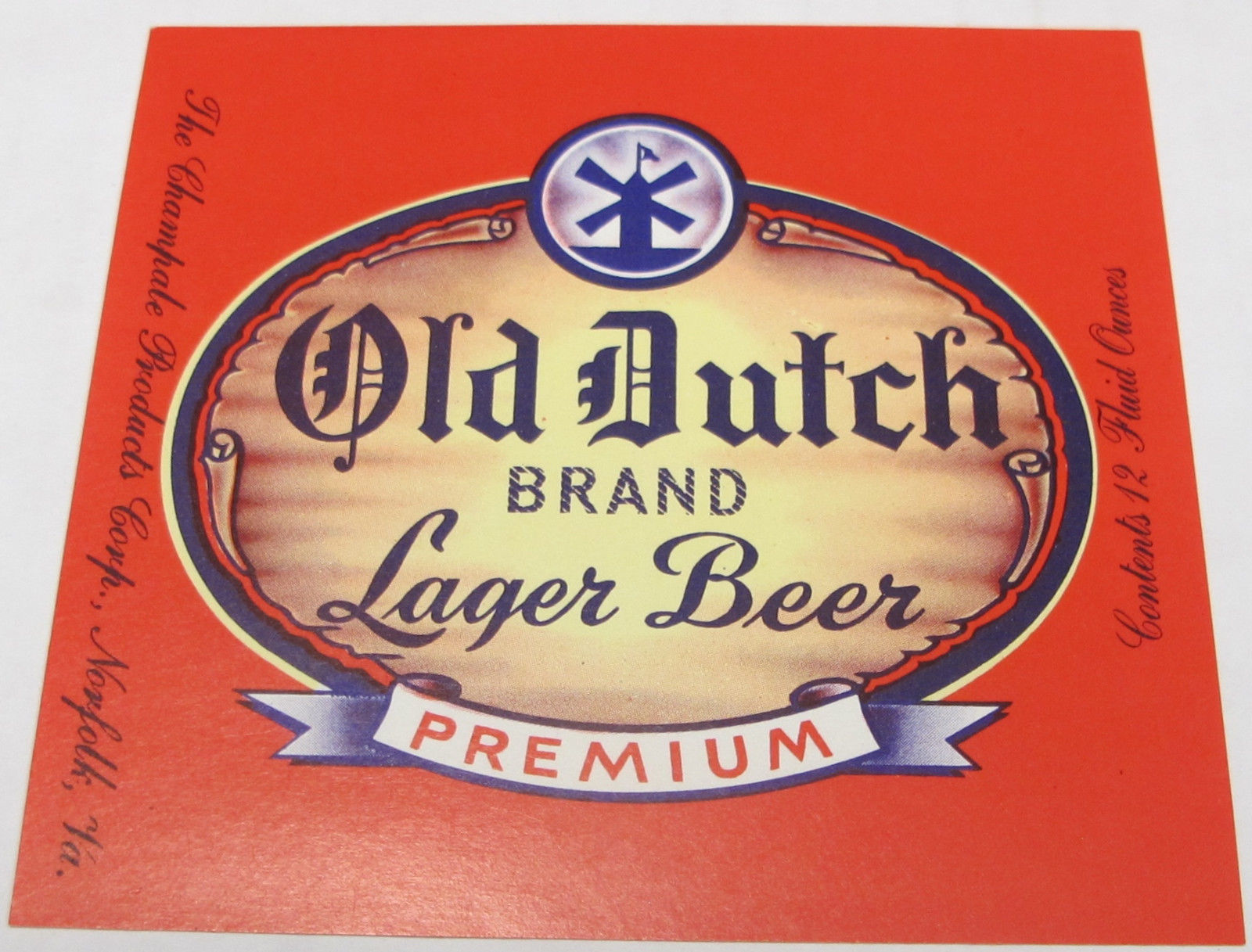 Old Dutch Lager Beer Champale Products Corp Norfolk VA unused 12 oz beer label.