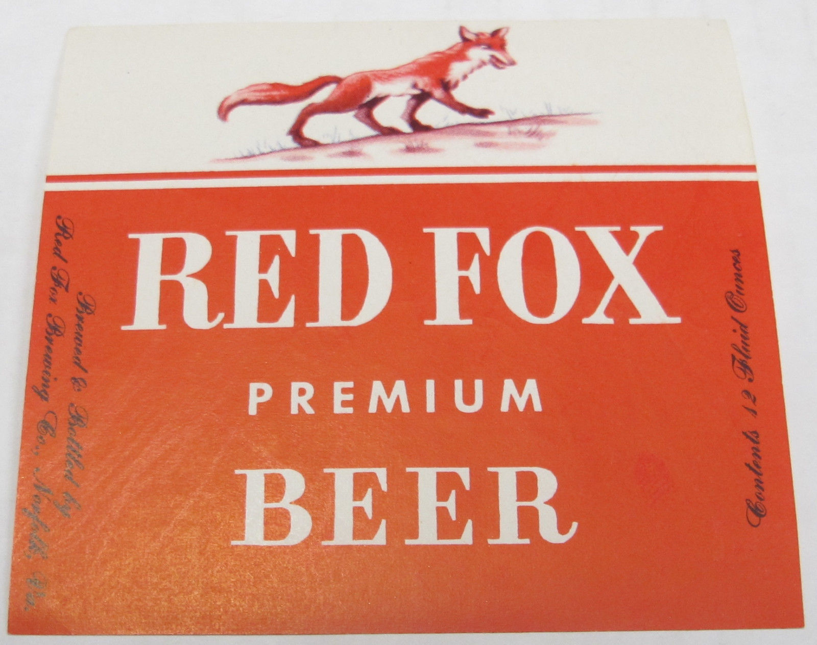 Red Fox Premium Beer Red Fox Brg Co Norfolk VA unused 12 oz beer label.