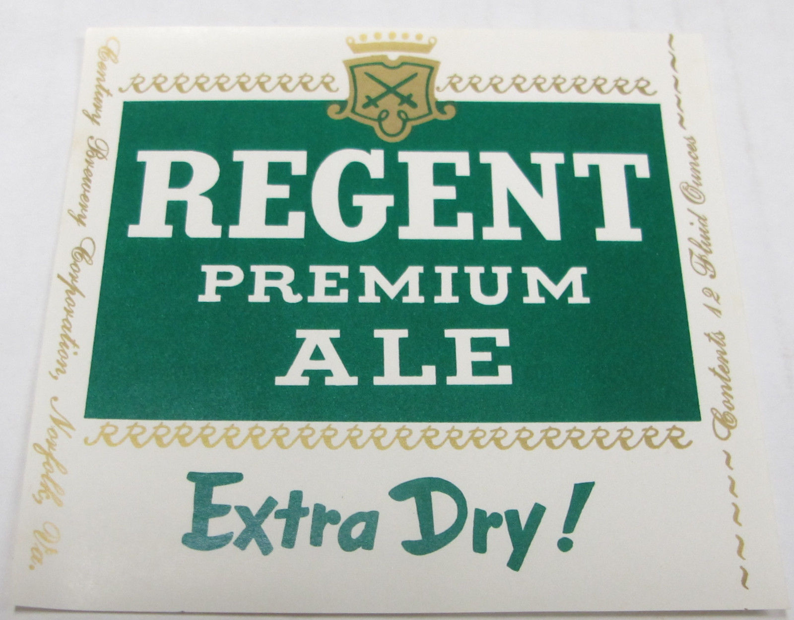 Regent Premium Ale Century Corp Norfolk VA unused 12 oz beer label.