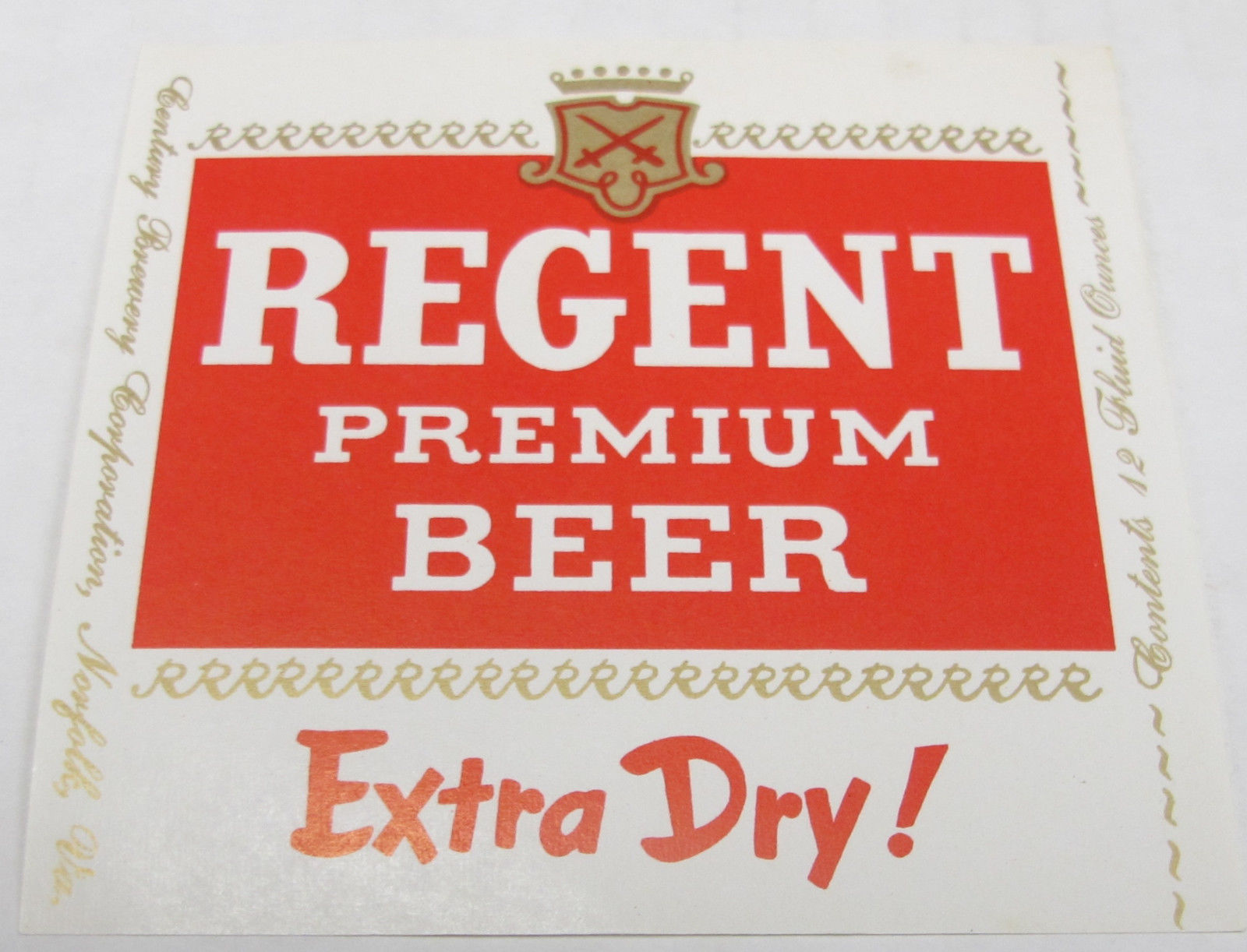 Title (ebay affiliate link): Regent Premium Beer Century Brewery Corp Norfolk VA unused 12 oz beer label.