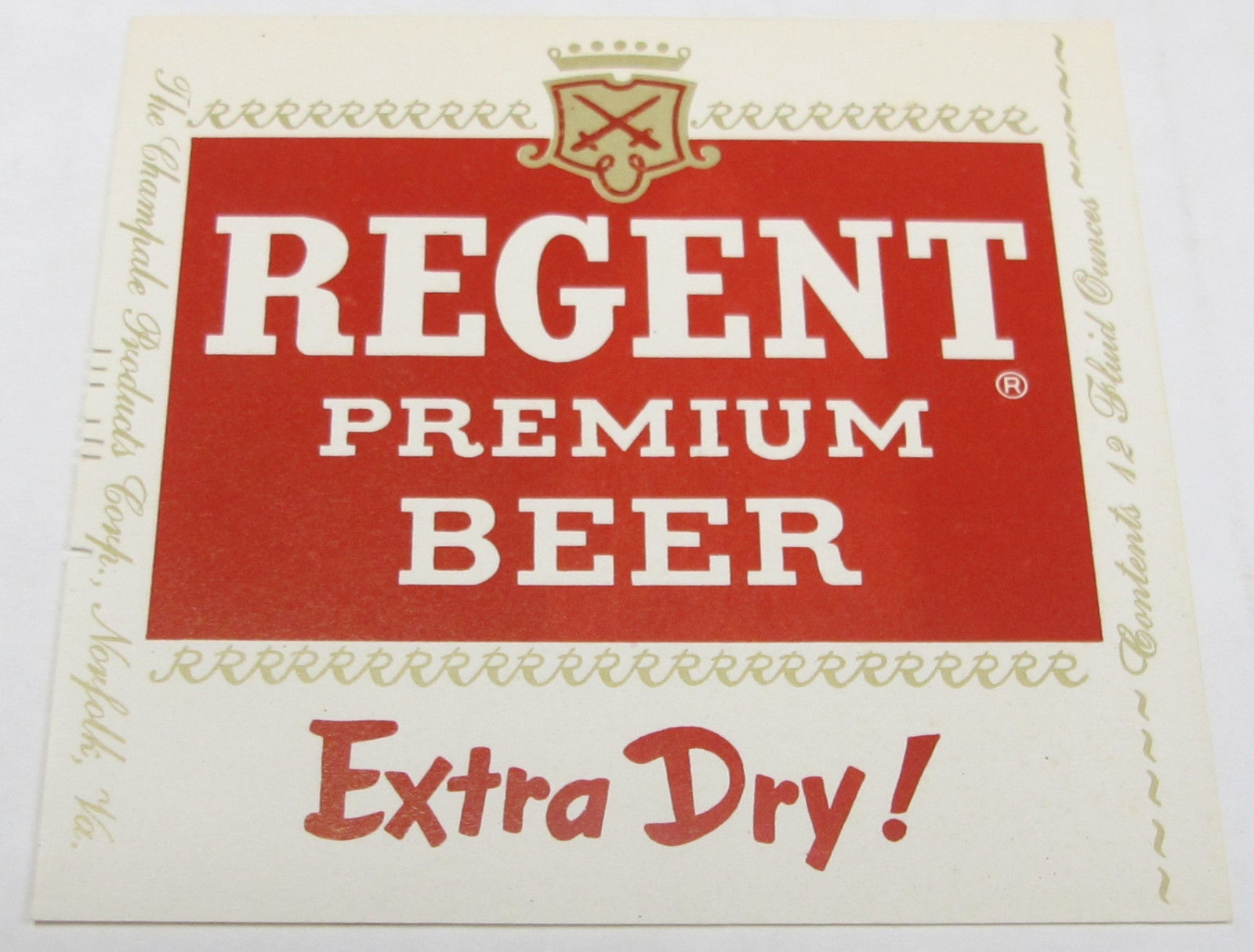 Title (ebay affiliate link): Regent Premium Beer Champale Products Corp Norfolk VA unused 12 oz beer label.