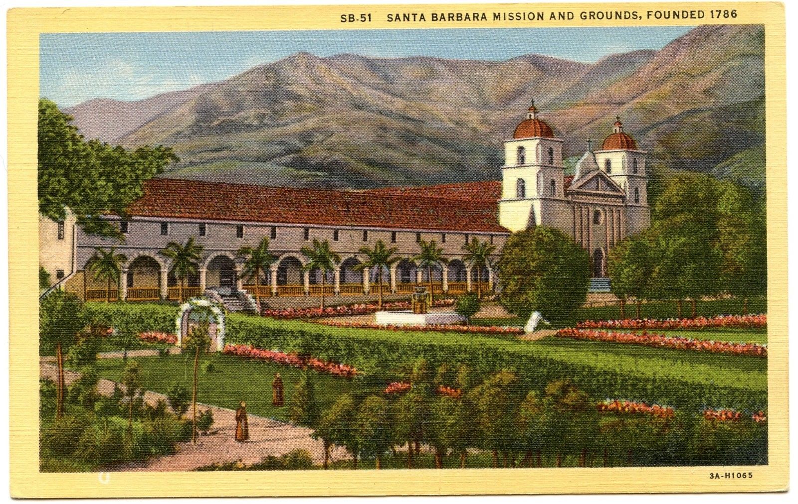 Title (ebay affiliate link): B4083 Santa Barbara Mission & Grounds CA - '33 Teich Linen Postcard No. 3A-H1065