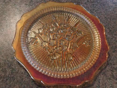 Title (ebay affiliate link): Vintage 1928-32 Iridescent Depression Glass Platter Iris Pattern