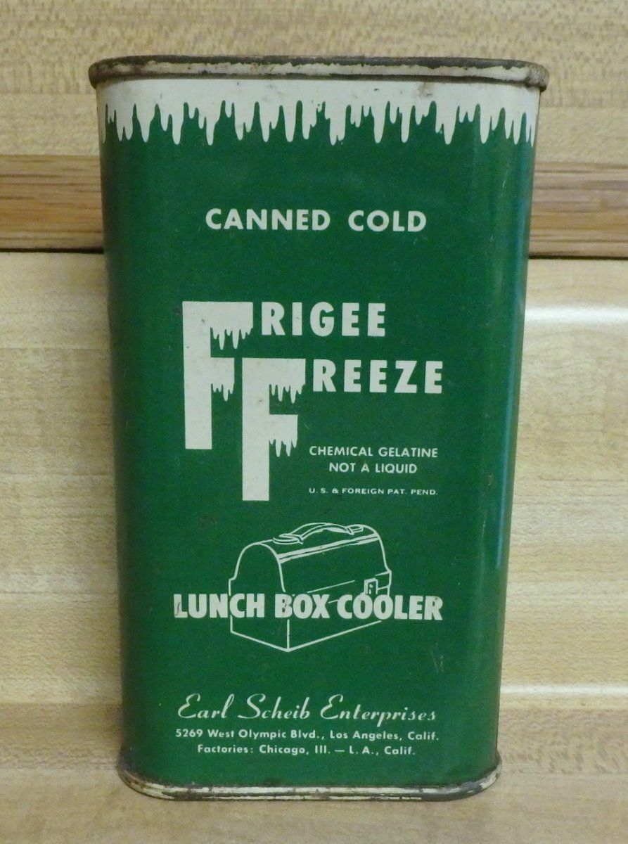 FRIGEE FREEZE Canned Cold Lunch Box Cooler TIN Earl Scheib Enterprises Antique