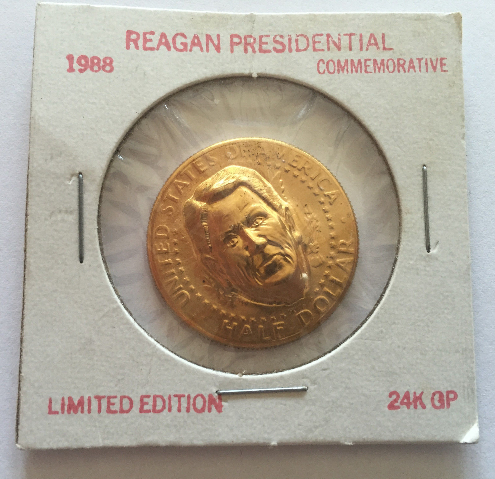Title (ebay affiliate link): PRESIDENT REAGAN Limited Edition 24K Gold Plate 3D COMMEMORATIVE MEDAL/COIN 1988