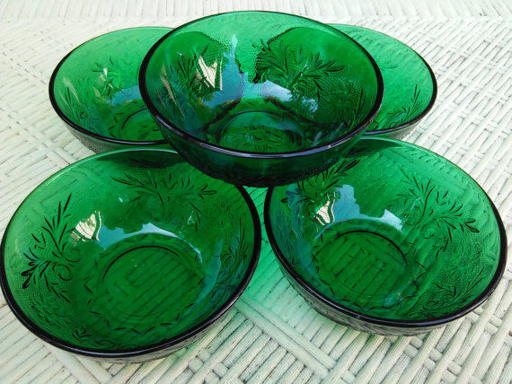 Title (ebay affiliate link): ANCHOR HOCKING - FOREST GREEN SANDWICH GLASS - BERRY / DESSERT BOWLS - Lot of 5
