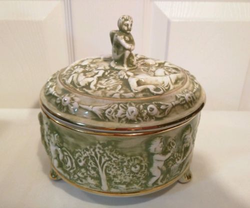 Title (ebay affiliate link): Vtg Capodimonte Italy Round Footed Cherub Candy Bowl with Lid - with Gold Trim