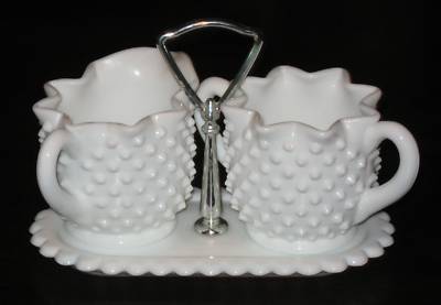 FENTON Hobnail Milk Glass Sugar & Creamer W/Caddy Set!