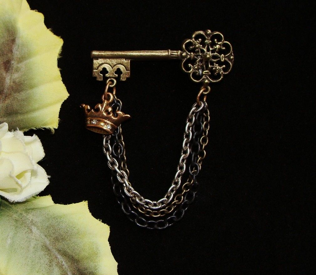 Title (ebay affiliate link): Nice! Vntg Tri Tone & Rhinestone Chains Crown & Key Dangle Brooch!
