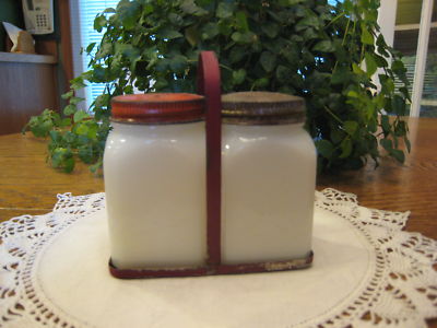 VINTAGE MILK GLASS SALT & PEPPER RANGE SET with HOLDER