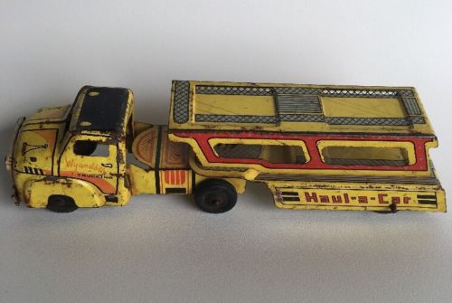 Title (ebay affiliate link): YELLOW TIN LITHO VINTAGE Haul-a-Car Wyandott's Trucking