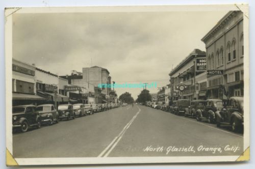 RPPC * NORTH GLASSELL, ORANGE CALIF. street scene cars stores theatre 1940's?