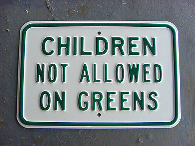 Title (ebay affiliate link): near mint 1960s Vintage CHILDREN NOT ALLOWED ON GREEN Old Golf Course Steel Sign