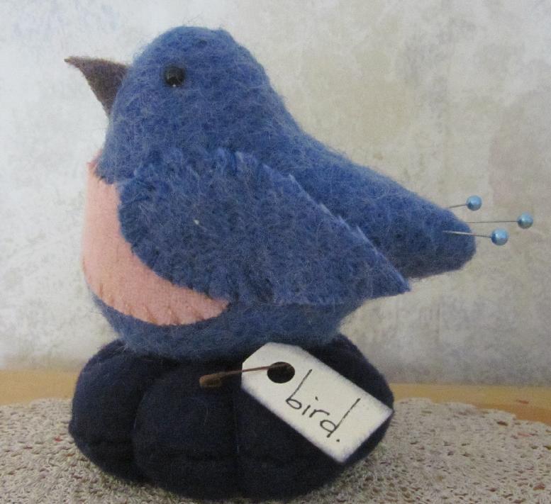 PRIMITIVE WOOL BABY BLUE BIRD HAPPINESS MAKE DO PIN CUSHION PFATT