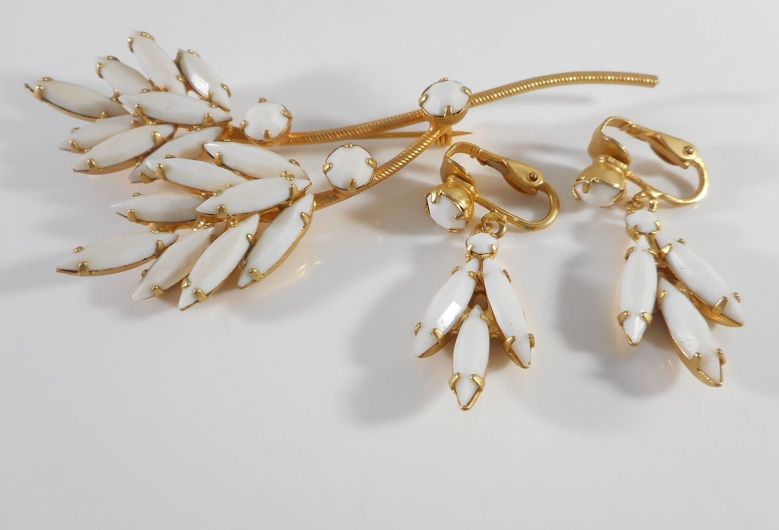 Title (ebay affiliate link): Vintage Gold Tone Milk Glass Flower Leaf Spray Brooch Pin Clip Earrings Set