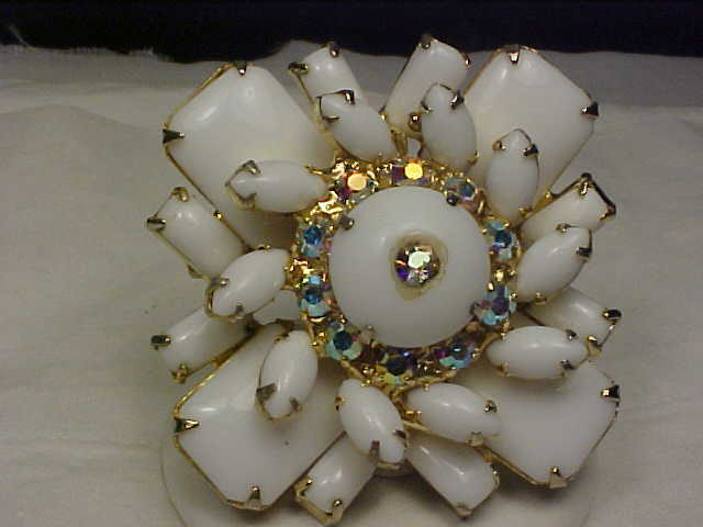 Beautiful Vintage Milk Glass & AB Rhinestone Brooch