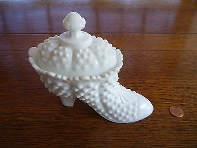 Vintage Fenton White Milk Glass Hobnail Victorian Boot w/ Lid Jewelry Box Dish