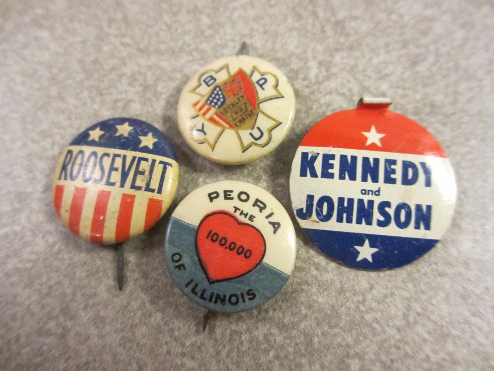 Lot of 4 VINTAGE POLITICAL KENNEDY, ROOSEVELT, RELIGIOUS, CITY PIN BACK BUTTONS