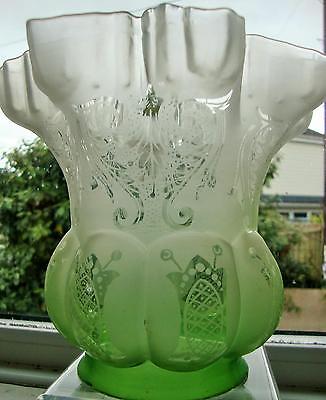 SUPERB LARGE ANTIQUE ACID ETCHED GREEN GLASS SHADE FOR OIL LAMP