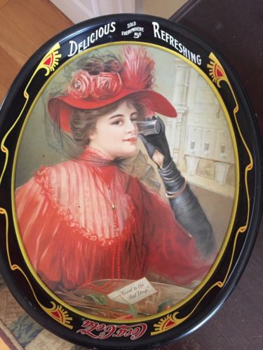 COCA COLA 1908 CALENDAR LADY OVEL METAL TRAY 15" OVEL