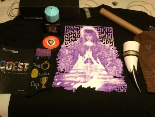 Title (ebay affiliate link): Loot Crate lot Harry Potter socks Uncharted poster Viking cup 2X Labyrinth shirt