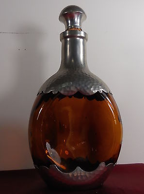 Vintage Amber Glass Hand Hammered Pewter Bottle Decanter Holland Daalderop