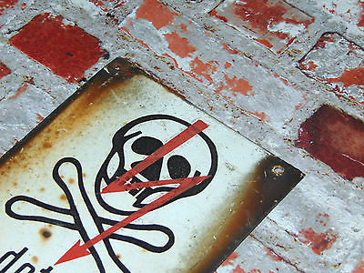 HARD VINTAGE! ANTIQUE ENAMEL WARNING SIGN - SKULL CROSSBONES THUNDERBOLT