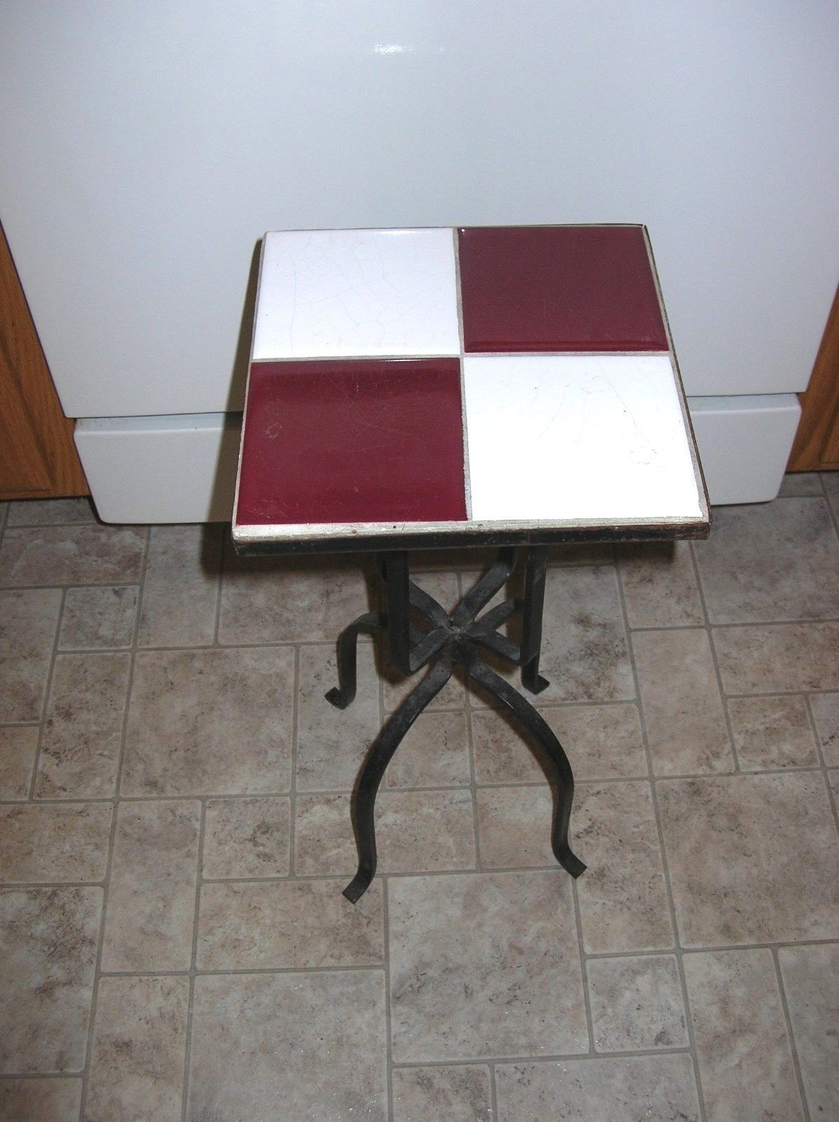 Title (ebay affiliate link): Vintage Mid-Century Wrought Iron Tile Top Table White Maroon Plant Stand