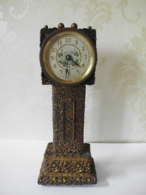 Title (ebay affiliate link): ANTIQUE ANSONIA MINIATURE GRANDFATHER CLOCK. FILIGREE GOLD CASE PAINTED FACE B1