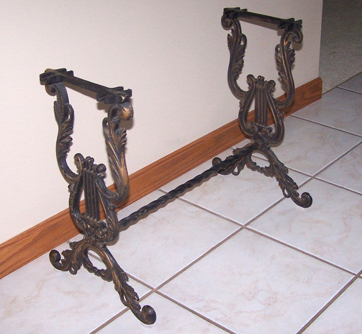 Title (ebay affiliate link): Vintage Cast Iron Fireside Bench Base ~ Harp or Lyre Design ~ Foundry Mark